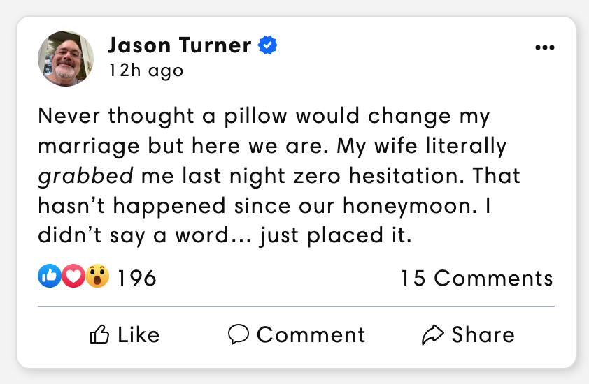 This pillow removes what makes her say no in the first place. When intimacy feels effortless instead of uncomfortable, her body stops hitting the brakes - and suddenly she's the one reaching for you.
